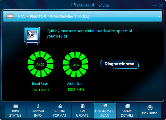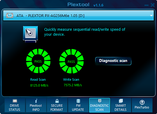 After running the Diagnostic Scan, it shows us the ‘awesomeness’ that is PlexTurbo. On the left we have our standard testing, with read speeds of 747 MB/s and write speeds of 580 MB/s. When we enable PlexTurbo on our PCIe SSD, we are now reaching read speeds of 8125 MB/s and write speeds of 7575 MB/s … Incredible! Also with Plextool, we can also check out the drive’s status, secure format the SSD, update the firmware, read into the SMART results and of course activate PlexTurbo.
