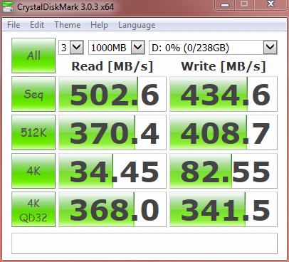 The M6M returned test scores that are lower than what Plextor has listed, which of course is expected as we have switched data types. The write speeds are almost not affected by this, with speeds reaching 434 MB/s, and read speeds that dropped slightly to 502 MB/s.