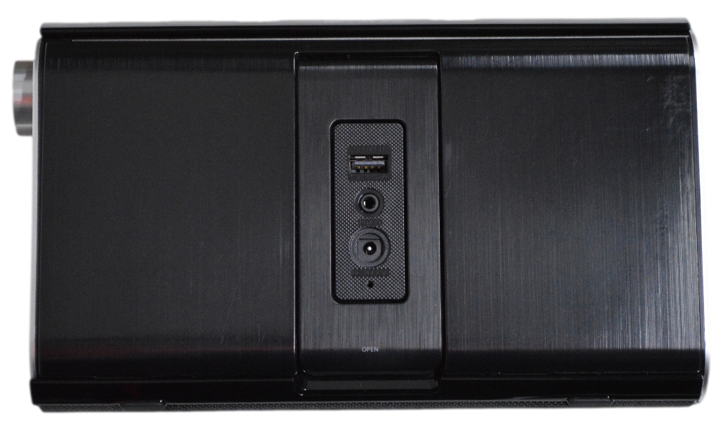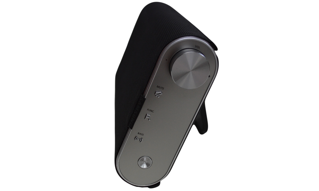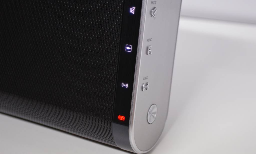 The front of the DA-F60 features four hidden LED indicators on the right bezel of the speaker. The first one you will find is the mute LED that will probably be flashing if you have silenced your music. The second is the input LED, which will notify you of which input is currently being used for sound playback. The next is the Bass indicator, which will only illuminate if you turn on the additional bass feature. Finally, the last one you may notice is the battery indicator, which has four colors to signify the battery level.