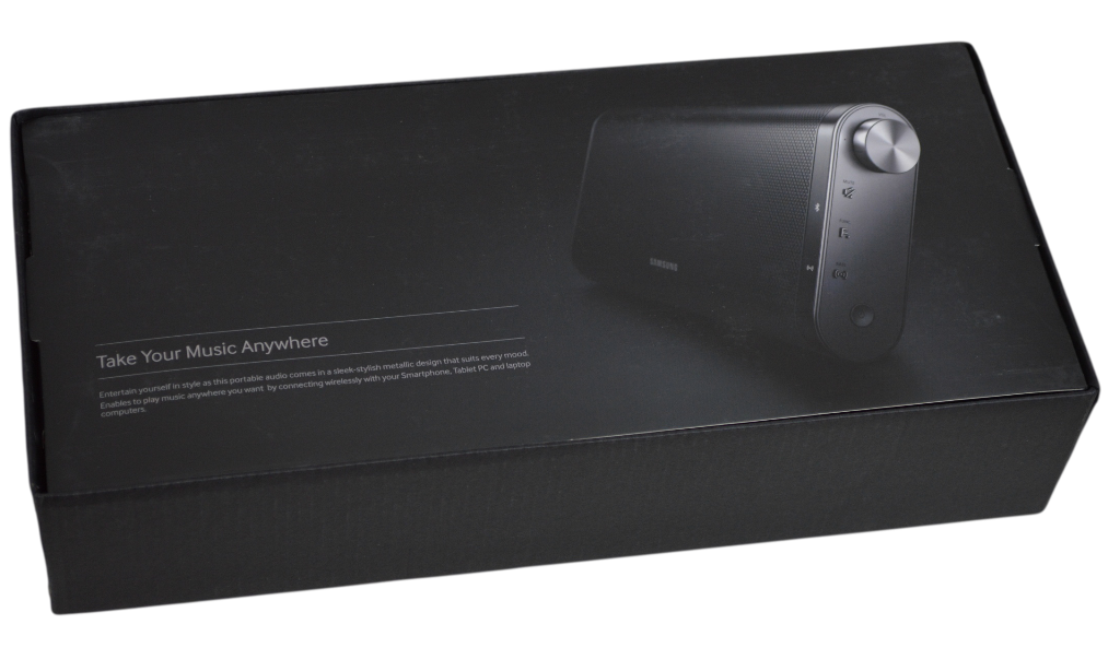 The back of the DA-F60 is relatively straightforward. There are three ports, the top being a USB port used strictly for service by Samsung, a 3.5mm audio jack so that you can plug your mobile device into the DA-F60 if it does not support Bluetooth or NFC. The last port on the wireless speaker is the power input. Just overlapping this input panel, you will find the stand to hold this little, but powerful, speaker up to help with audio projection.