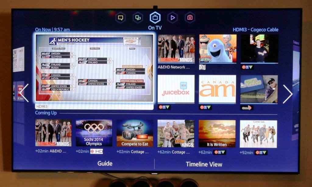 Samsung has come a long way with their Smart Hub, earlier versions of which we found just plain frustrating. When you start the Smart Hub, the main screen displays your present channel, as well as recommended and upcoming channel selections. There are four additional panels which can be navigated to via the top, sides, voice control or gestures.