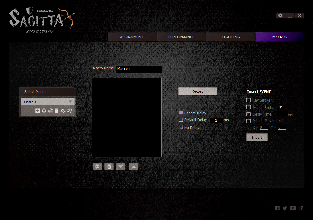 The final page of the software is the one that will be of the utmost importance to the gamer in you. The Macro page, that programmed algorithm of repetitive clicks stored into your mouse to help you kick some serious butt. Recording those multiple functions and having them available in a single click is the difference between life and death and Tesoro has hit the nail on the head with the macro recording. Good Job.