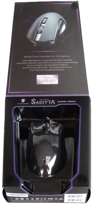 Tesoro has done a great job with the packaging of the Sagitta, allowing you to not only get a great look and understanding for the Sagitta before ever using it but the flips open exposing a firsthand look and feel with a small opening at the bottom of the case allowing you to get your hand right in there and get a taste for the shape of the Sagitta. This is by far one of the more creative retail packages we have come across for a mouse.