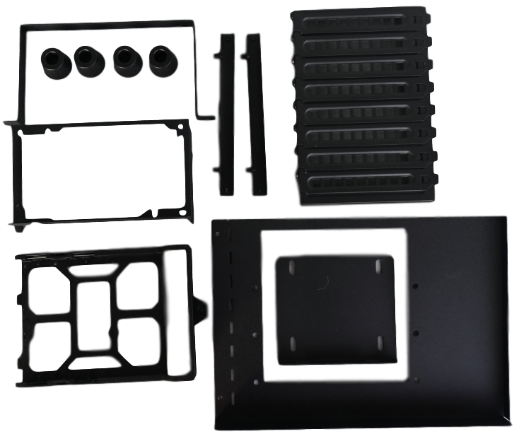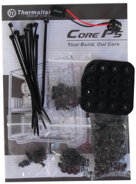Unscrew the thumbscrews on the side of the main steel chassis and you’ll be able to pop it right open, where you’ll find the rest of the accessories and documentation for the build. The Core P5 accessory pack includes 45 6-32 x6mm screws, 10 stand offs for motherboard installation, 32 M3 screws (16 5mm and 16 7 mm), cable ties, a nut setter, rubber and a buzzer.