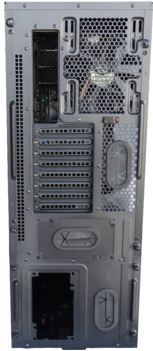 Around the back you’ll see there are eight PCI slots as well as three rubber grometted pass-throughs. One of those is attached to a removable plate which is where you can house a PSU. Off the top of our heads we can’t figure out what we would use these grometted pass-throughs for but in the scenario creativity kicks in with loop cooling there’s always that.