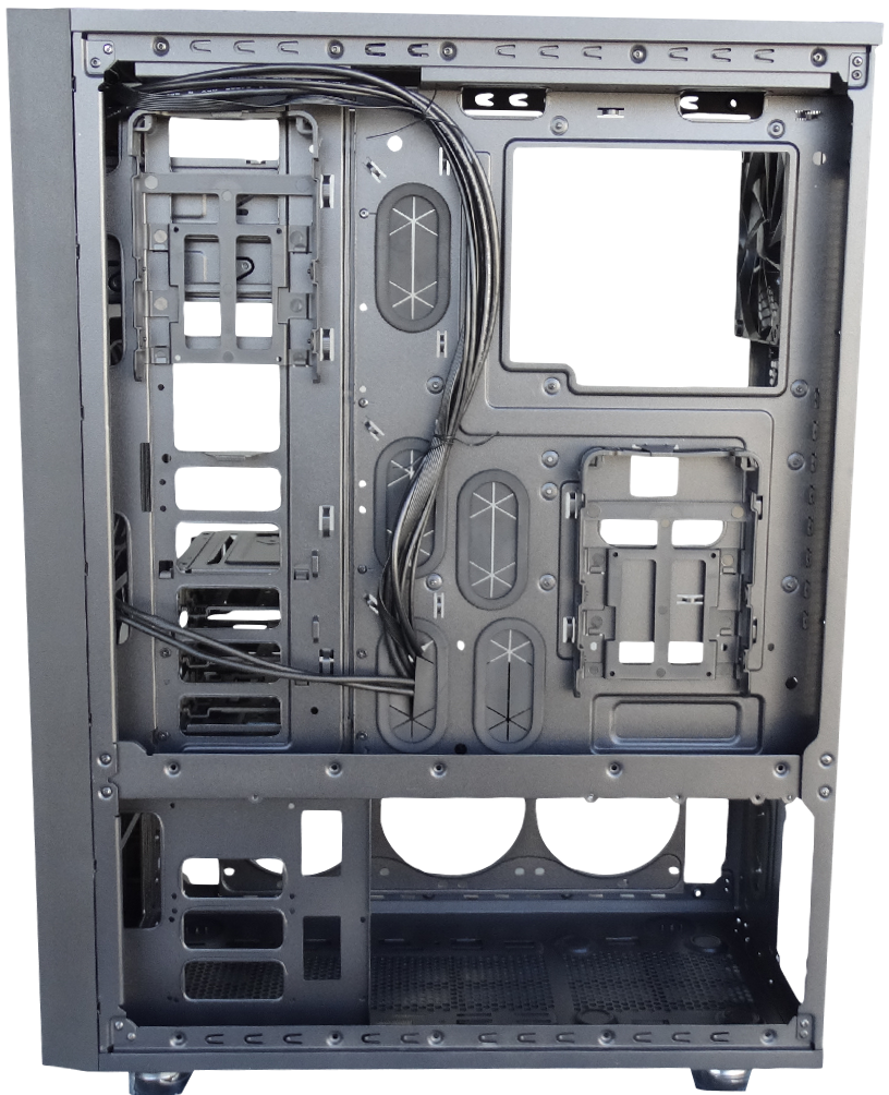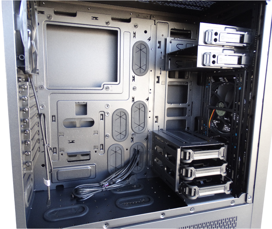 All four panels are connected with thumbscrews that stay in the removable panel when undone, this helps from having to keep track of them and we like to see that. Over to the Cable management panel removing that, as well as the bottom compartment panel you’ll see there is ample room for cable management, there is also two additional drive housings which run up the left side, as you can see we have removed the lower of the two and moved it to the right of the case to show alternative placement. If you remove your drive bays from the opposite side you could always take one to this side so you could essentially have three mounted back here.