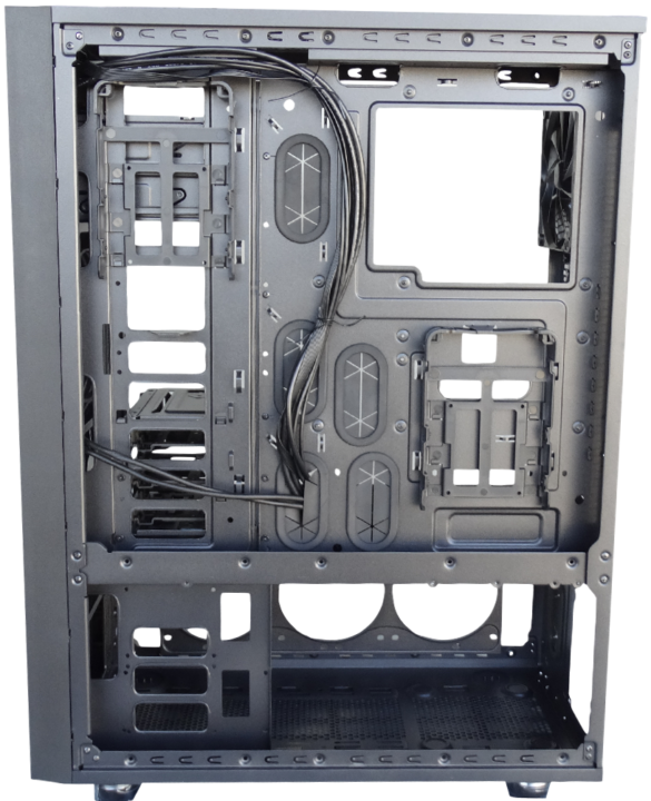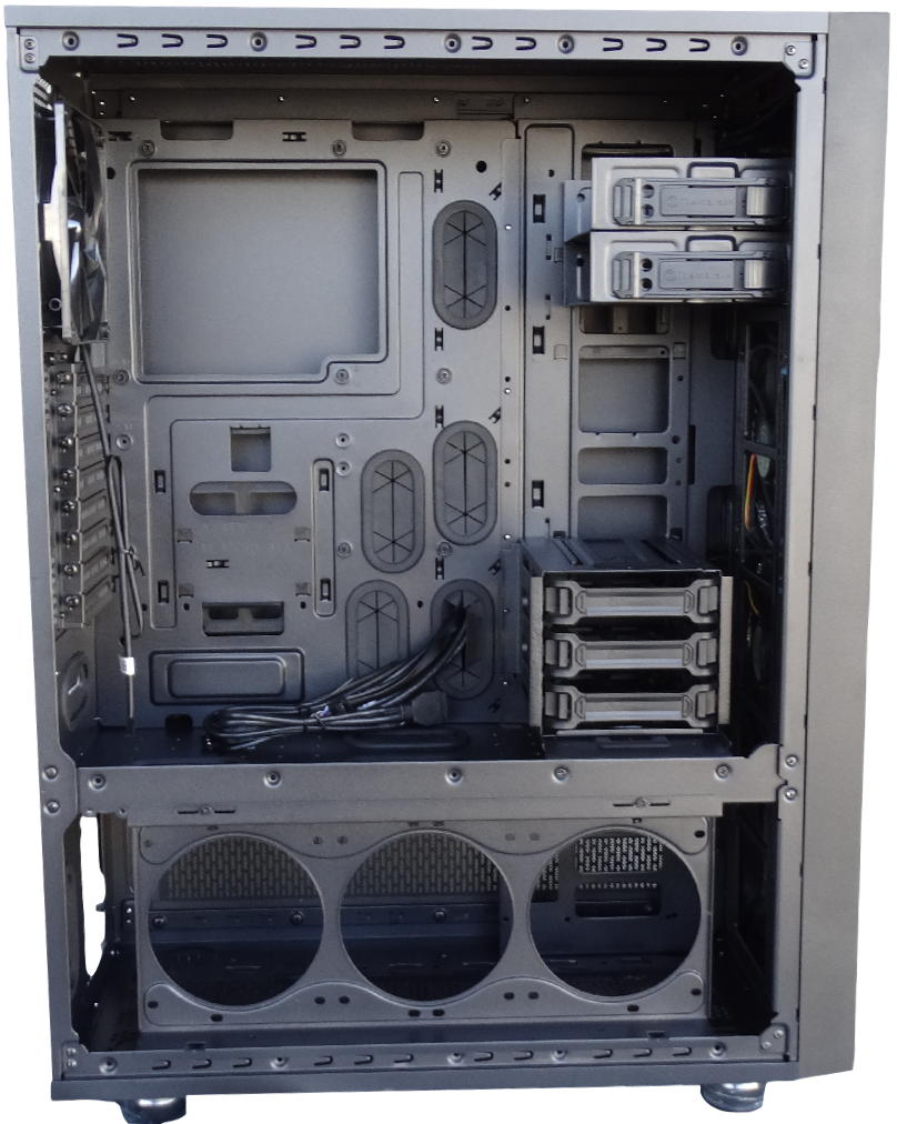 Needless to say you won’t run out of space for your components unless you are putting in an intentional effort to. There is also a large opening for exchanging your CPU cooler without removal of the motherboard as well as an abundance of rubber grometted pass-throughs. Five on the component back itself as well as three on the floor of the top compartment allowing access to the bottom compartment. The two OD bays as well as the three HDD/SSD removable trays are completely modular and can be removed to get to the max clearance size we discussed.
