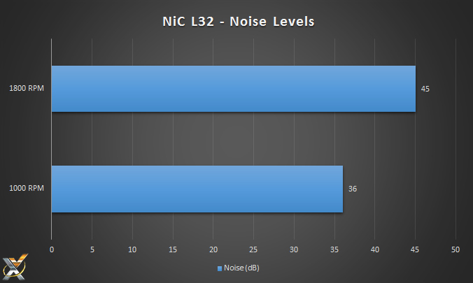 As we can see, the NiC L32 outputs a noise level of 45 dB at full speed, which we found to be quite loud. At idle, it was much more pleasant as it was only slightly louder than the rest of our system at 36 dB.