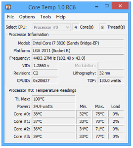 We monitored our processor’s temperature using CoreTemp; a lightweight application which runs in the background and displays detailed CPU temperature information on a per-core basis.