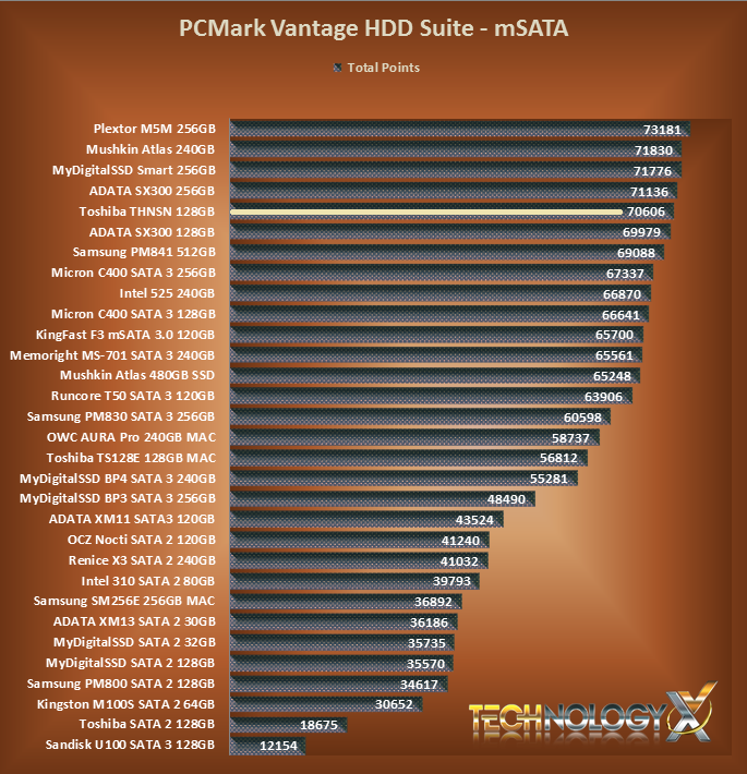 Our mSATA Hierarchy Chart displays all mSATA SSDs tested to date, at TechX or TSSDR, and their ranking has been determined by PCMark Vantage Total Point Score only: