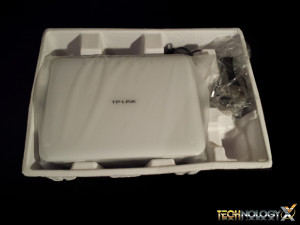 Inside the box, we’ll find the router itself wrapped in a soft plastic material and secured within an egg-container like packing material. Underneath and to the right of the router we’ll find the accessories, which include the router’s three detachable external high-gain antennas, power plug, a Cat5e ethernet networking cable, and the Quick Installation Guide.