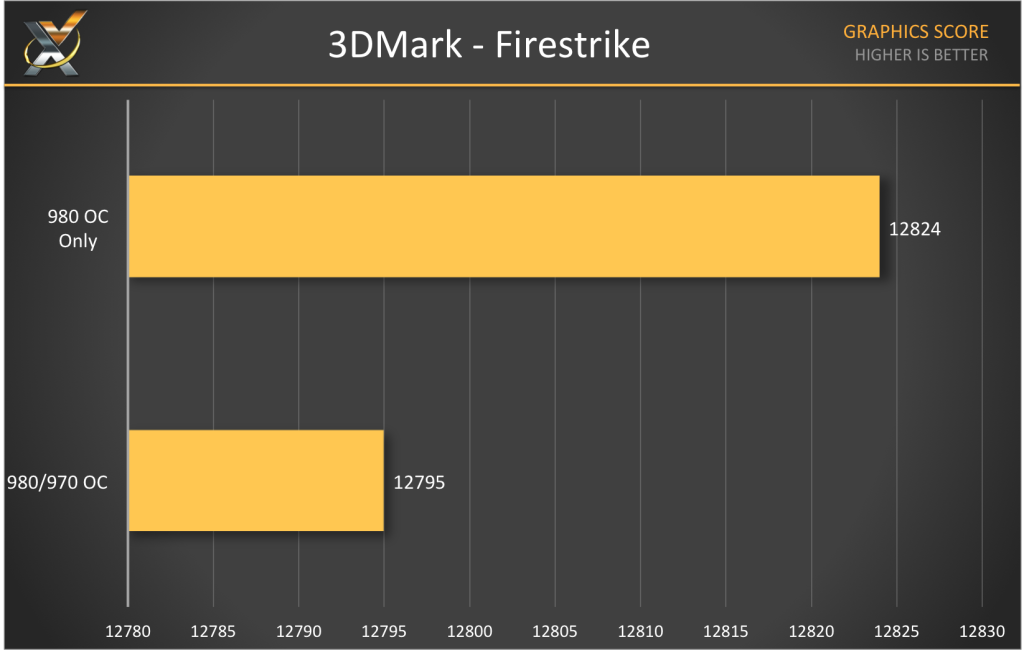 Interestingly enough, the standalone GTX 980 substantially out performed the other configurations. This is a good indicator of what we can expect going forward. Next we kept the GTX 980 as the graphics processor and the 970 as the PhysX processor. Then we tested with the 980 overclocked, then with both cards overclocked.