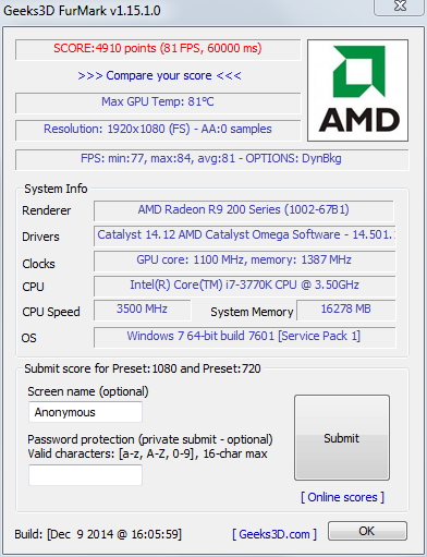 As seen to the left (click to enlarge image), after running the GPU burn-in test at the 1080p preset our GPU got to a Max of 84C and scored 4910 while overclocked.