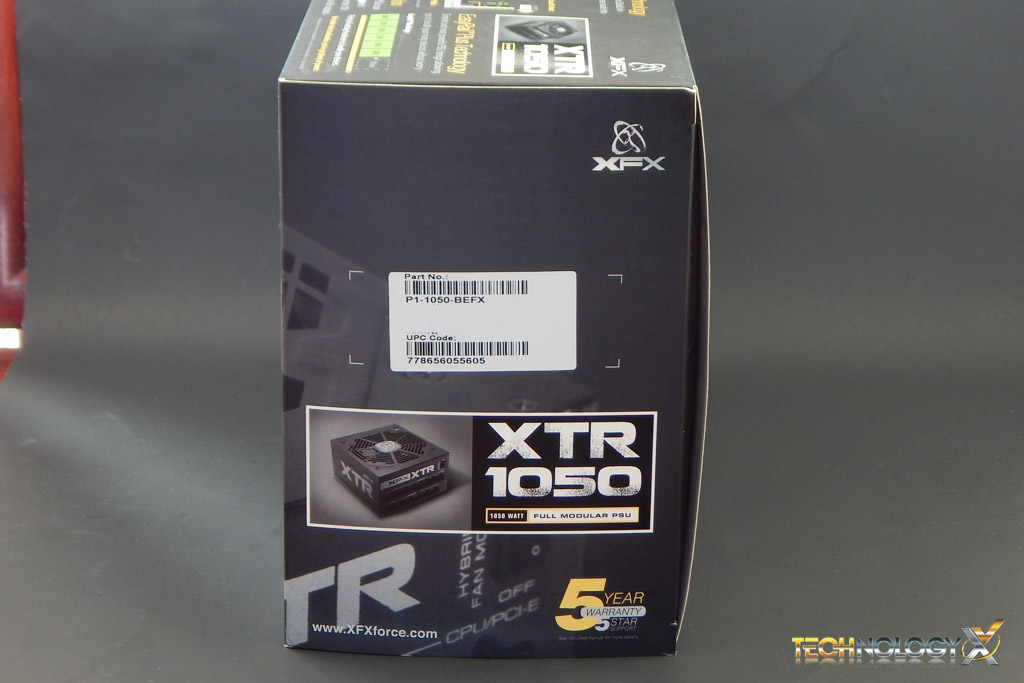We have on the top of the box an explanation of the features we went over previously and another hero shot of the PSU. Finally on the sides we see XFX’s 5 year warranty being shown