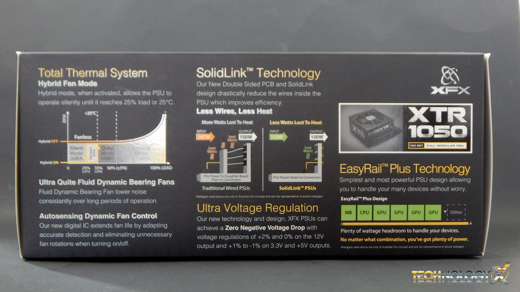 On the back we see XFX standing by its wattage, this being a Seasonic unit we expect our XFX XTR 1050 to stay at its rated wattage and efficiency under all, but the most extreme circumstances. They also explain its fully modular design, hybrid fan mode as well as sporting 8 PCI-E 6+2 Pin Connectors, which allows quad graphics support for those looking to go all out.