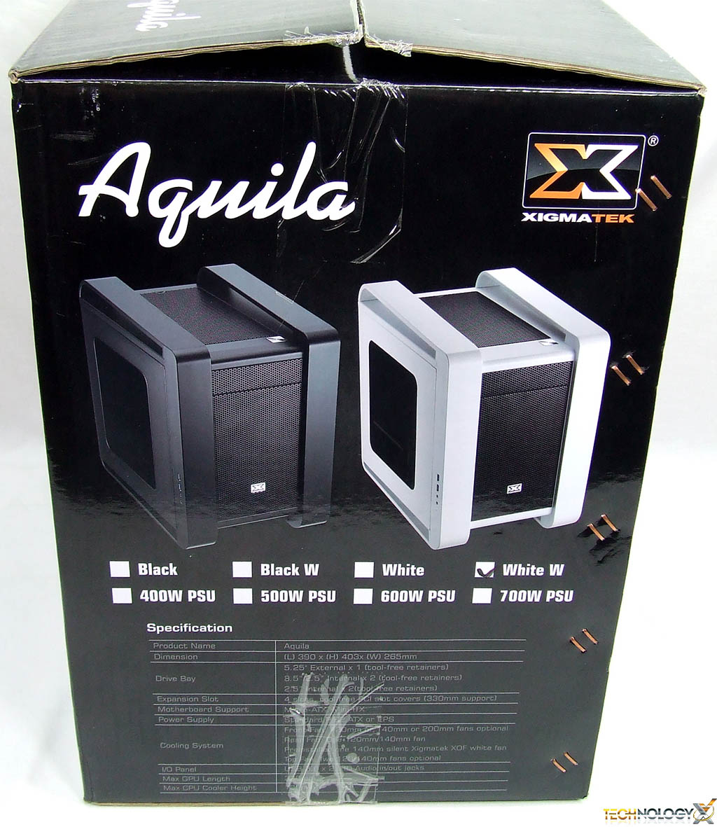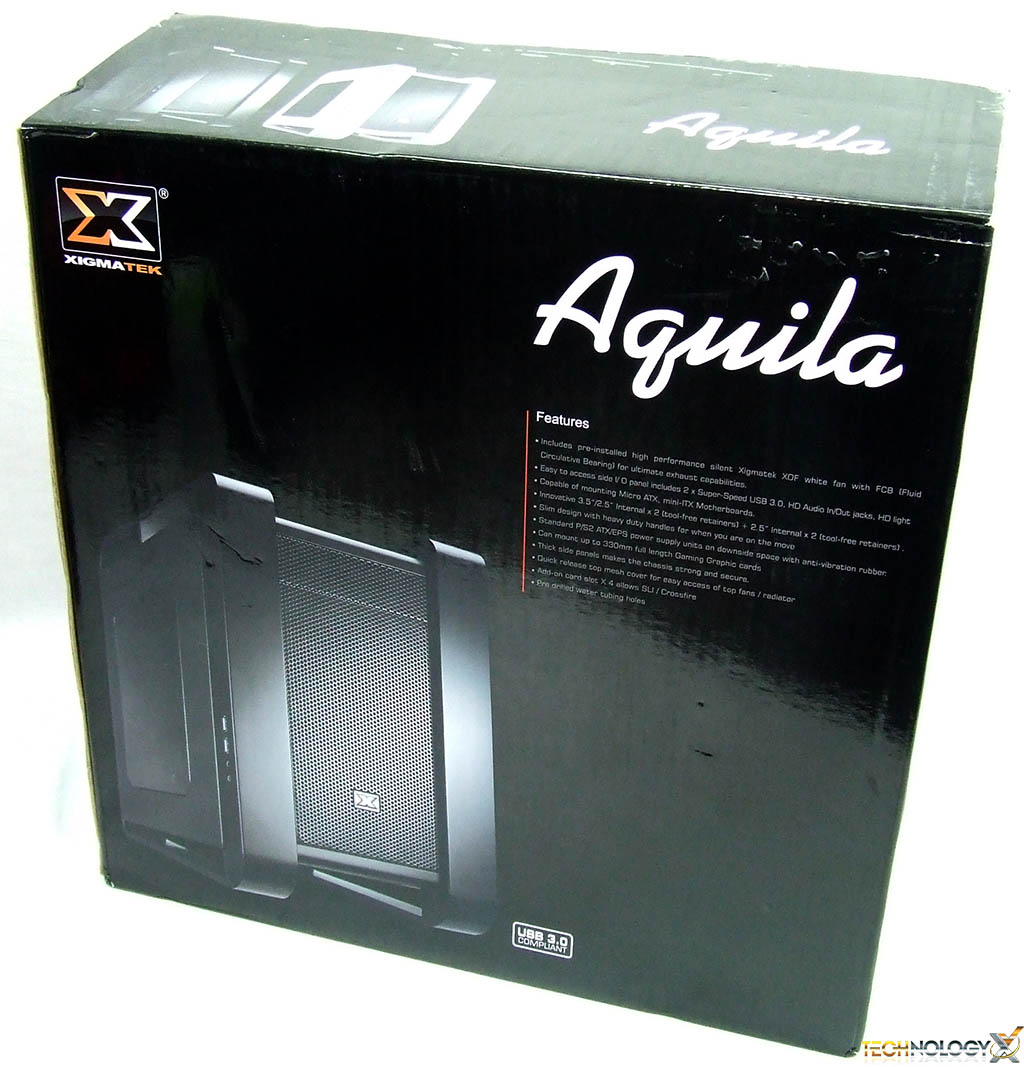 Xigmatek packaged the Aquila in a large glossy full-color box. The front shows an image of the case, the name, Xigmatek logo and lists the features.