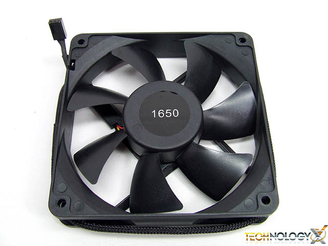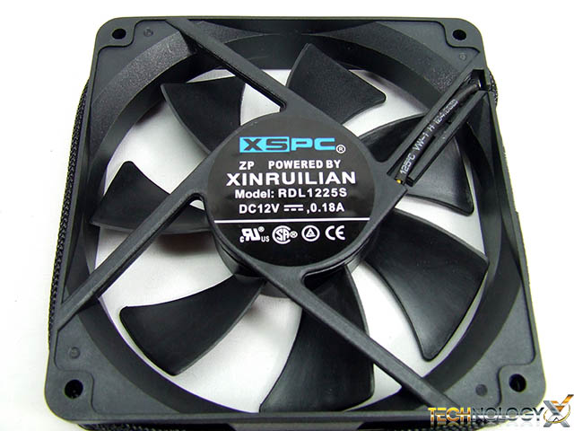 The fans included with the kit are 7-blade 120mm units manufactured by Xinruilian for XSPC. They’re rated for 1650RPM and 0.18A @ 12VDC and come sleeved in a black nylon sleeving.