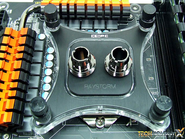 Now XSPC says to tighten the lower threaded collar to apply significant pressure to the CPU block. I found however that even with these collars all the way up the acrylic bracket was bending slightly under the tension of the four screws.