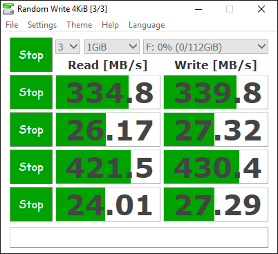 Crystal Disk Benchmark is visually straightforward, and is used for measuring the speeds at which your storage device reads and writes in both compressible (oFill/1Fill) and random, mostly incompressible, data. Random data is more consistent with everyday use of a computer, such as transferring videos, pictures and music. We run the benchmark twice, using oFill data first, and then proceeding to test with random data. Since results typically return with nearly identical scores, we only include the results for random data samples.