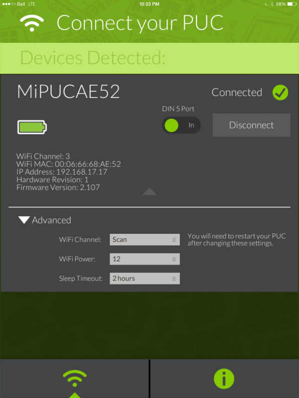 To use the PUC you will need to have your iOS open with the PUC Connect app downloaded. You then connect your iOS device to the PUC’s wireless network. If you are watching the PUC, you will see the WiFi logo change from a flashing green to a solid green – that means you are ready to go! Once your in the app and connected, you will see a bunch of info regarding your connection to the PUC.