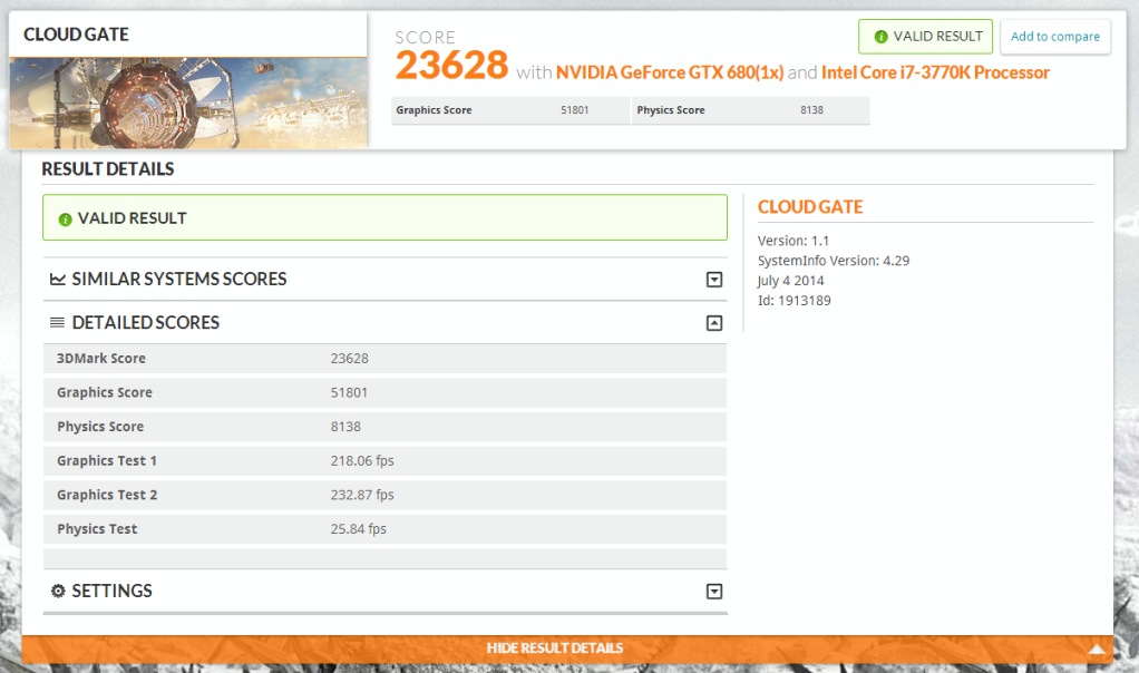 Our first benchmark test achieves a total score of 23628, while maintaining over 200 fps in both graphical tests. Our physics test did return with a lower than expected score of 25 fps.