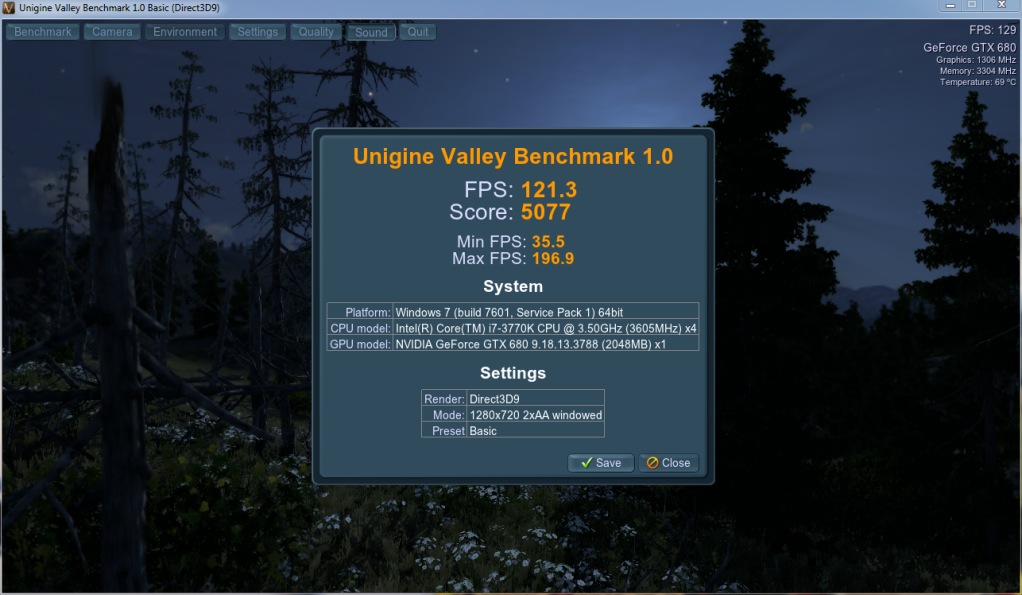 The ZOTAC graphics card ran through our Valley benchmark on the basic preset and returned a total score of 5077, also averaging around 121 fps.