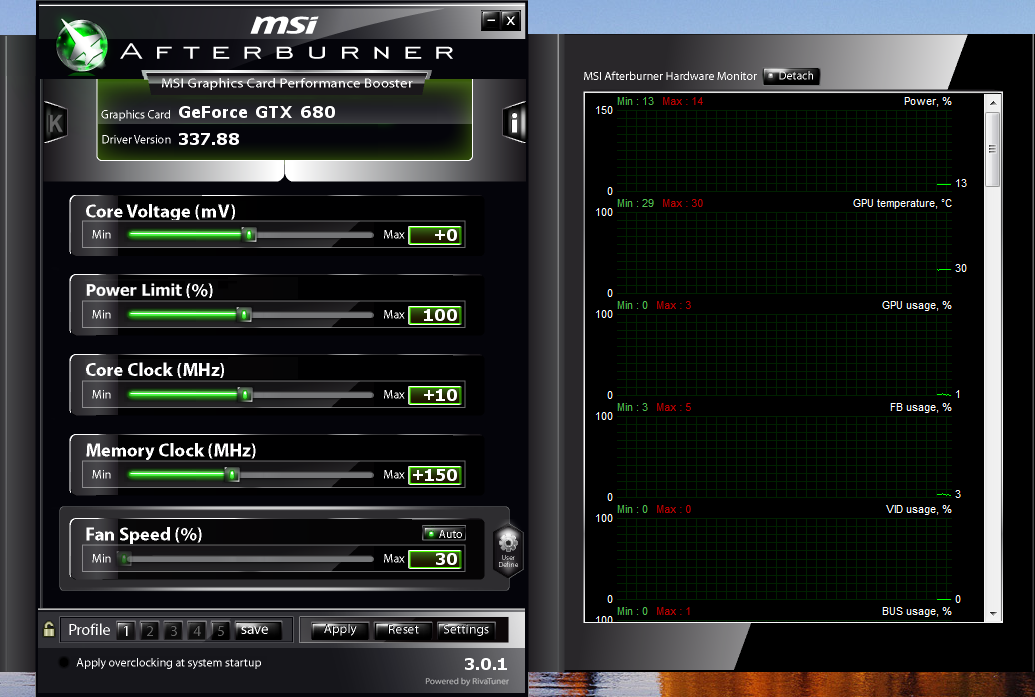 The over clocking process is quite easy, using MSI Afterburner we slowly increased the Core Clock Rate by 10 MHz. Once we have a stable Core Clock Rate, we adjusted the Memory Clock Rate the same way. Going one step further we adjust the Core Voltage in small increments to push out a few more improvements in Core and Memory Clock Rate, until the card runs stable without seeing artifacts and crashing.