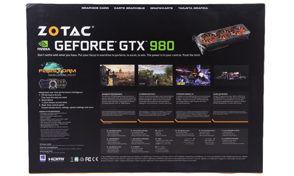 The ZOTAC GeForce GTX 980 AMP! comes in the usual largely-sized packaging which features a basic overview of the card on the front, where the back keeps you updated on it’s specifications.