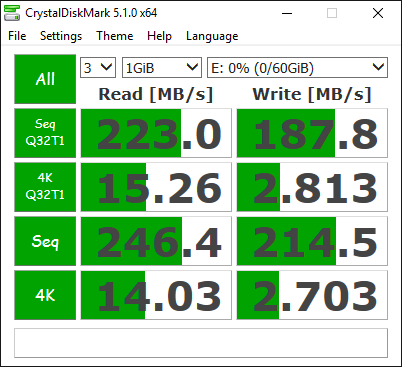 It comes equipped with an unbranded 4GB microSD card, which we found to be pretty weak. Also, an average flying session, of about 12 minutes, will eat up the entire 4GB when recording at 1080p. Take a look at Crystal Disk Mark (random test data) and AS SSD benchmarks below: