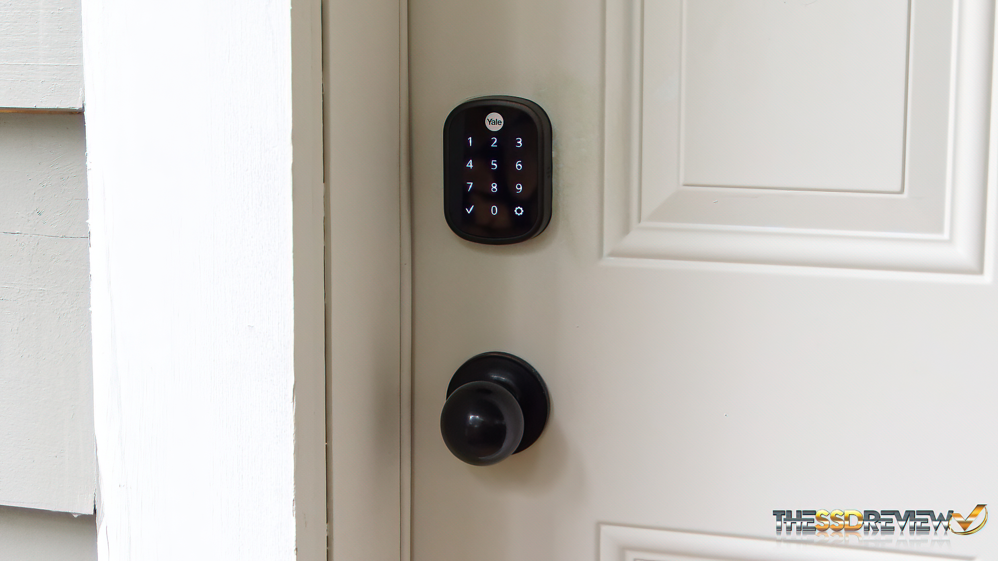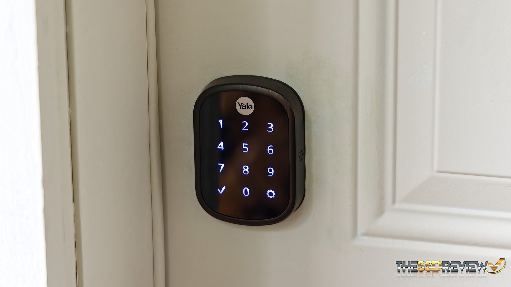 This is the Yale LiftMaster Smart Touchscreen Deadbolt with the LED numbering lit up after installation on our garage door. Physical installation is quick and painless with just a switch off from the old deadbolt and then programming our Master Code along with a pin or two for entry.