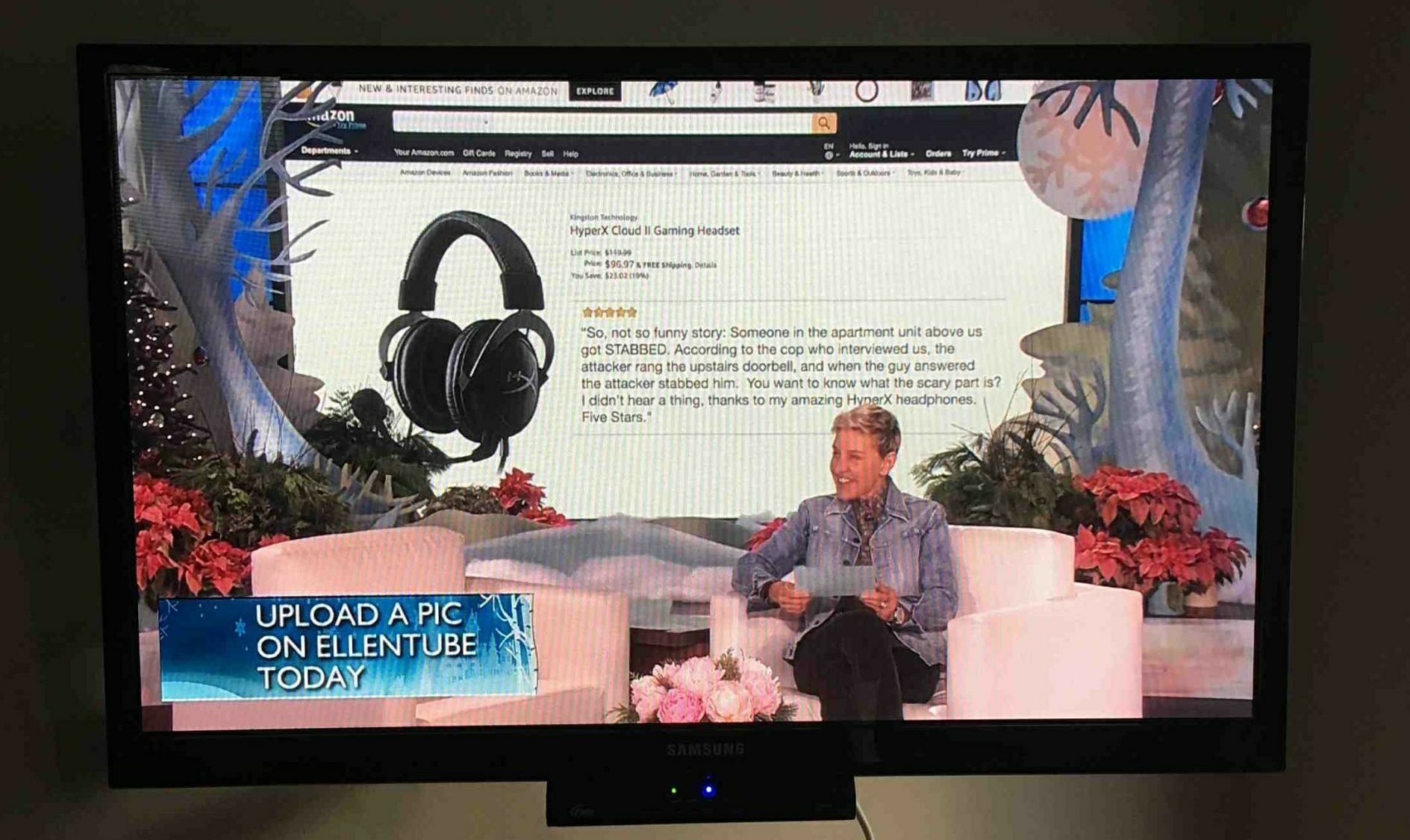 But first, I want to share my funny story from Ellen yesterday. As you all know, we are fortunate enough to review HyperX products, but can not (I promise you) take credit for this. She is showing her Twelve Days of Christmas Giveaways… so of course, since I can’t be there I watch from the comfort of my livingroom. Fortunately, I had my phone with me and caught this quick shot. The circumstances, have not been confirmed and are surely not supported to test, but we do love HyperX gaming headphones.