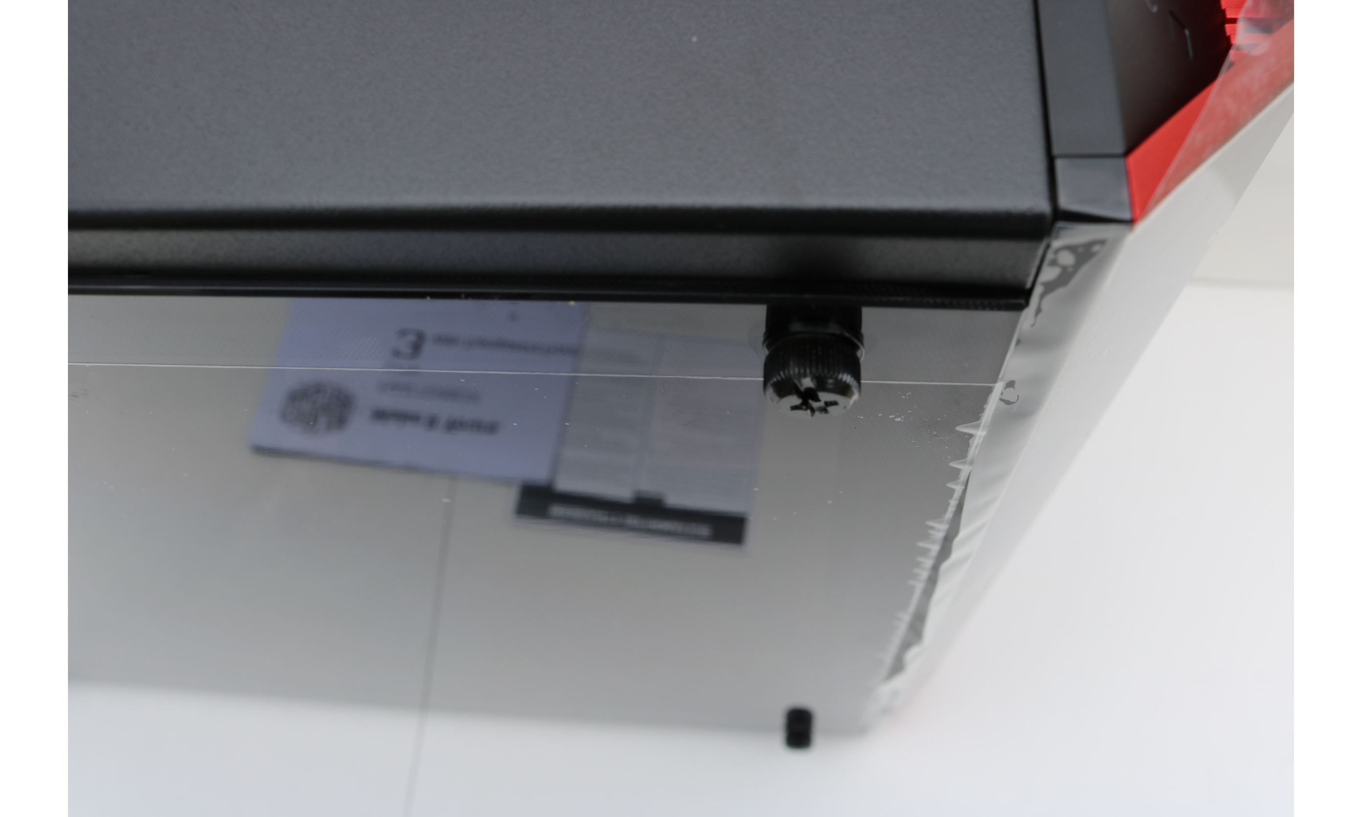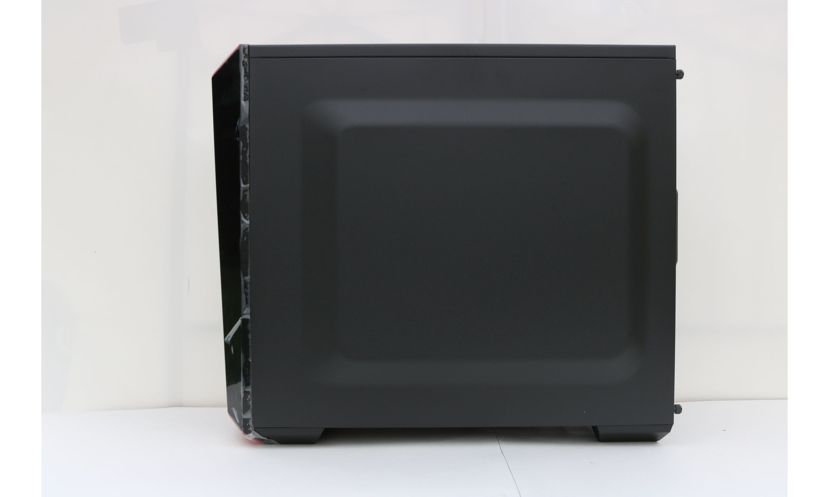 The body of our 3.1 is very standard and includes a see through plastic window to show off your components on the main compartment side. Four thumbscrews mounted with rubber backings hold the transparent panel the the body.