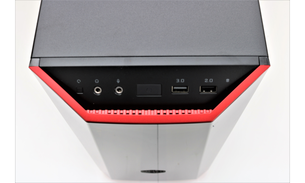 Now well start going into one of the best aesthetic features of our Lite 3.1. The front panel has a very cool design with a reflective plastic as well as red on black accents. The IO is very simple and is located on top of the front panel.