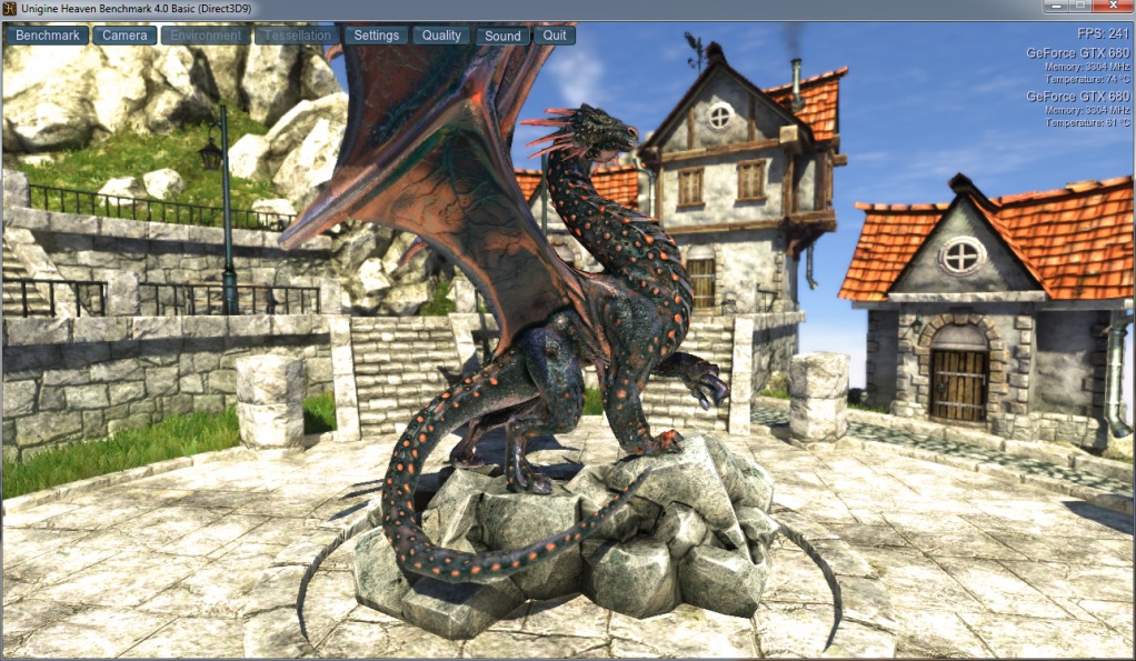 Heaven Benchmark immerses a user into a magical world of shiny brass, wood and gears. Float around flying islands, a tiny village with its cobblestone streets, above the amazing sight of fluffy clouds, followed up by a dragon statue on the central square. This benchmark test is powered by the UNIGINE Engine again that utilizes the advanced capabilities of graphics cards. Here we have two presets to walk through: Basic and Extreme.