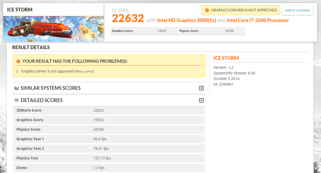 The integrated graphics returned with a total score of 22632, while achieving as high as 96 fps in the graphics test and 137 fps in the physics test.
