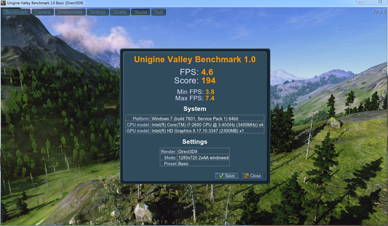 The integrated graphics ran through our Valley benchmark on the basic preset and returned a total score of 194, also averaging around 4.6 fps. Upon testing in Extreme and Extreme HD, we were greeted with a lovely error message upon starting the test. We can presume that this is due to the incompatibility of the integrated graphics.