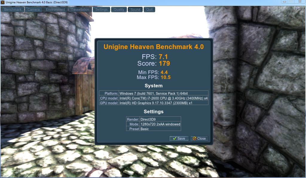 In the basic setting our graphics card’s Heaven benchmark, our integrated graphics achieved a total score 179 and an average fps of 7.1. Upon testing in Extreme and Extreme HD, we were greeted with the same lovely error message upon starting the test. We can again presume that this is due to the incompatibility of the integrated graphics.