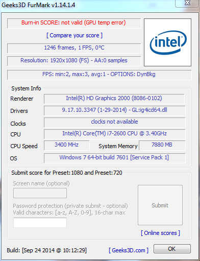 Our integrated graphics managed to make it through Furmark without any artifacts or crashing. However, it failed to return any results due to a temperature error. We can also see that it achieved an average frame rate of 1 fps.