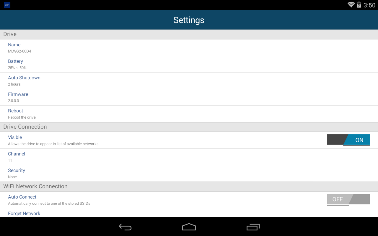 There are multiple settings one can adjust via the app such as auto shutdown time, the SSID name for the device, and if a 3G dongle is connected or not. The first thing to always do is to lock down the wireless connection with a password.
