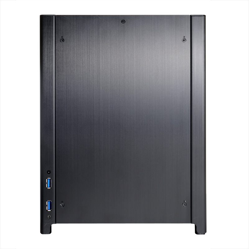 The front of the PC-Q27 features the elegant brushed aluminum look that Lian Li is known for. The only non-aluminum part of the front is the dual LED illuminated power button that glows blue when on and red while loading. The I/O panel with two USB 3.0 ports is located on the right side of the front of the chassis so not to interrupt the elegant aesthetics.