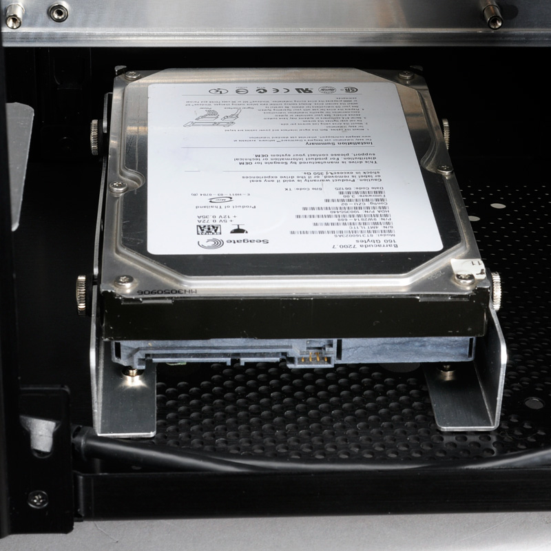 Up to three 3.5” hard drives can fit inside the PC-Q27 with one of the 3.5” drives using the 5.25” drive bay space. For builders wanting to take advantage of the high speeds of solid state drives (SSDs), a single 2.5” drive can be installed on the bottom of the chassis. One more SSD can be installed in place of a 3.5” drive on the front HDD cage.
