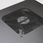 The PC-Q28, with dimension of (WxHxD) 227mm x 305mm x 345mm (8.9” x 12.0” x 13.5”), sits up off the ground thanks to its front and rear feet stands much like like the PC-Q27. This is especially important since the Lian Li PC-Q28 does not have visible front ventilation. Instead, the front 140mm fan pulls in air from a vent on the bottom of the chassis, which reduces system noise, while providing effective cooling. The dust filter over the vent prevents dust from coming in. For expelling hot air out of the chassis, there is a top 120mm fan.
