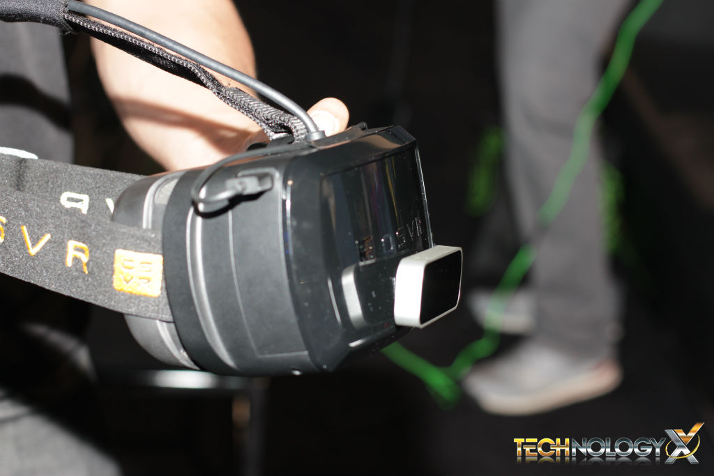 We got to try on the developer kit and play one of their tech demos, which featured a LeapMotion controller as input device. The devkit features a single 1080p screen and adjustable lenses for getting the right focus. In our quick demo, we found it to work quite well however we did experience a fair amount of motion blur and the screen itself is definitely not high enough resolution as we experienced a “screen door” effect. That being said, this is only the first devkit for OSVR and it is produced with low-costs in mind.