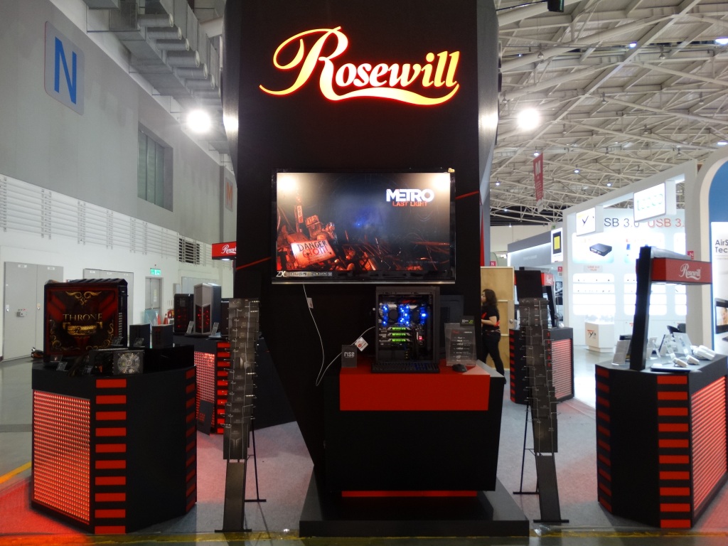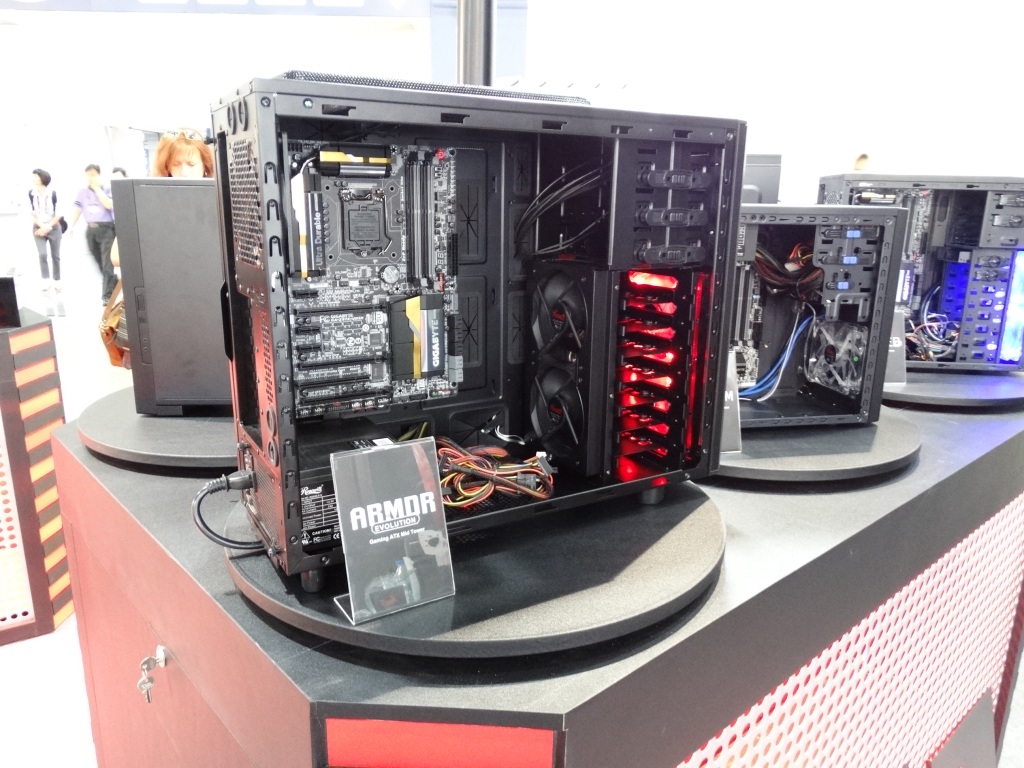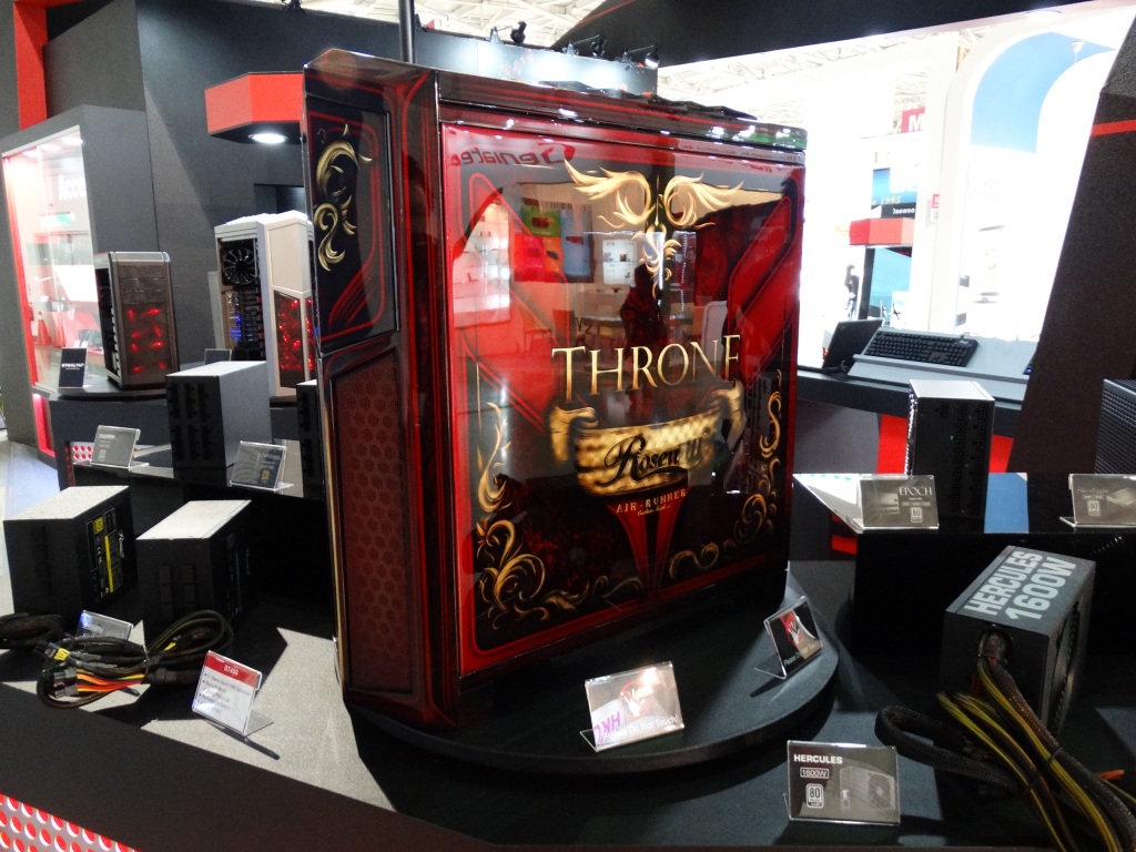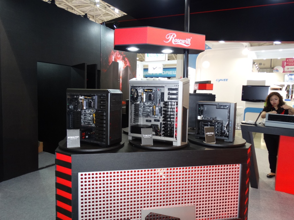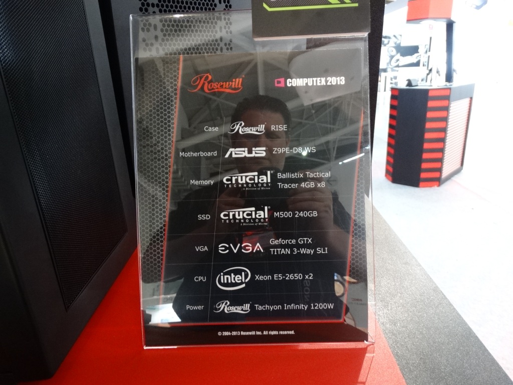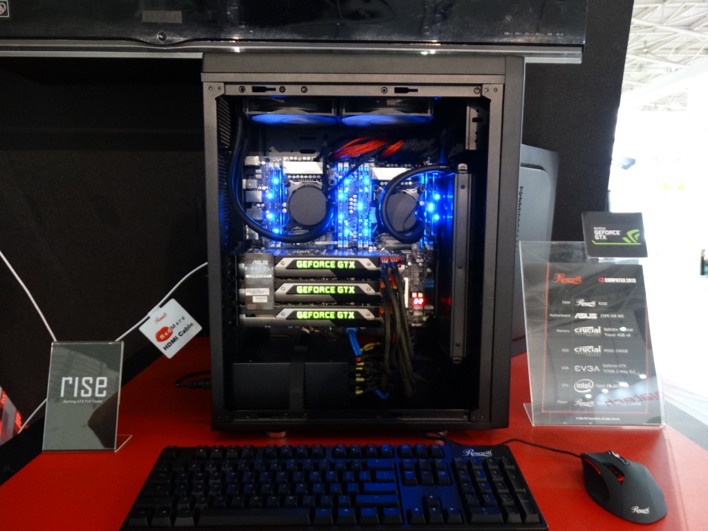 The most stunning display came in the custom-built Rosewill Rise system, featuring dual Intel E5 Xeons, 3-way SLI EVGA GeFORCE GTX TITAN graphics cards, and 2 x 280mm water cooling units all in a nice package featuring the ultimate high end components.