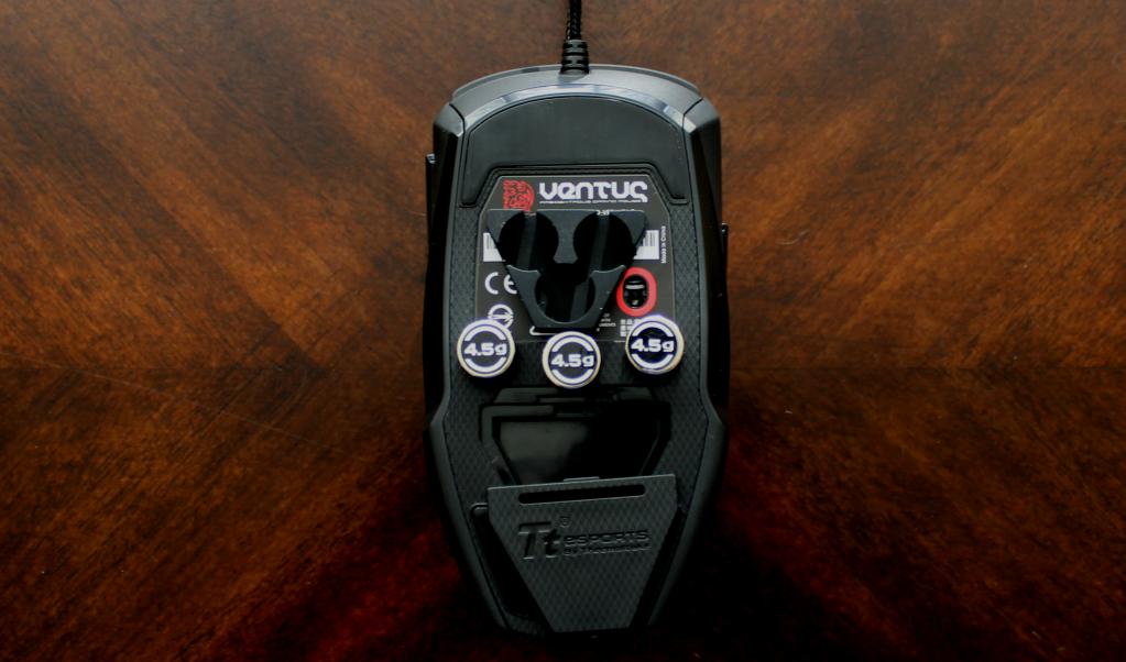 When you flip the mouse over there is a small panel that you can open to change the weight of the mouse. Inside there are three 4.5 gram weights which can be added or removed to tailor the preference of any user. in evaluating this product, we tried every combination of weights until we found the right combination for our needs.