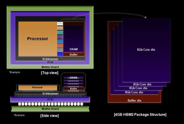 Samsung HBM DRAM cross section diagramSamsung’s newest DRAM package provides 2356GBps of bandwidth, which doubles that of HBM1 DRAM packages. The fastest data speed per pin among currently manufactured DRAM chips is the 36GBps of a 4Gb GDDR5 DRAM chip. The new HBM2 version offers a seven-fold increase over that level of performance. The 4GB HBM2 also provides enhanced power efficiency by effectively doubling the bandwidth per watt as compared to a 4Gb-GDDR5-based solution, as well as embedded ECC (error-correcting code) functionality, which results in high levels of reliability.