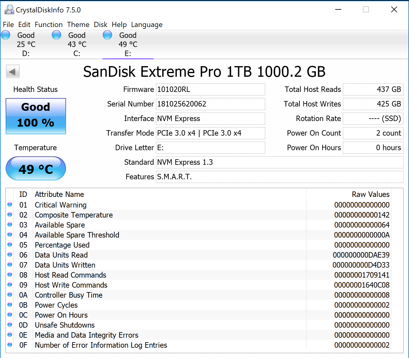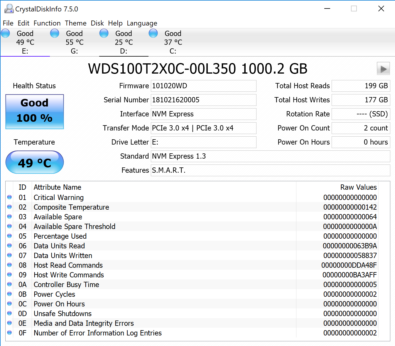 Crystal Disk Info is a great tool for displaying the characteristics and health of storage devices. It displays everything from temperatures, the number of hours the device has been powered, and even to the extent of informing you of the firmware of the device.