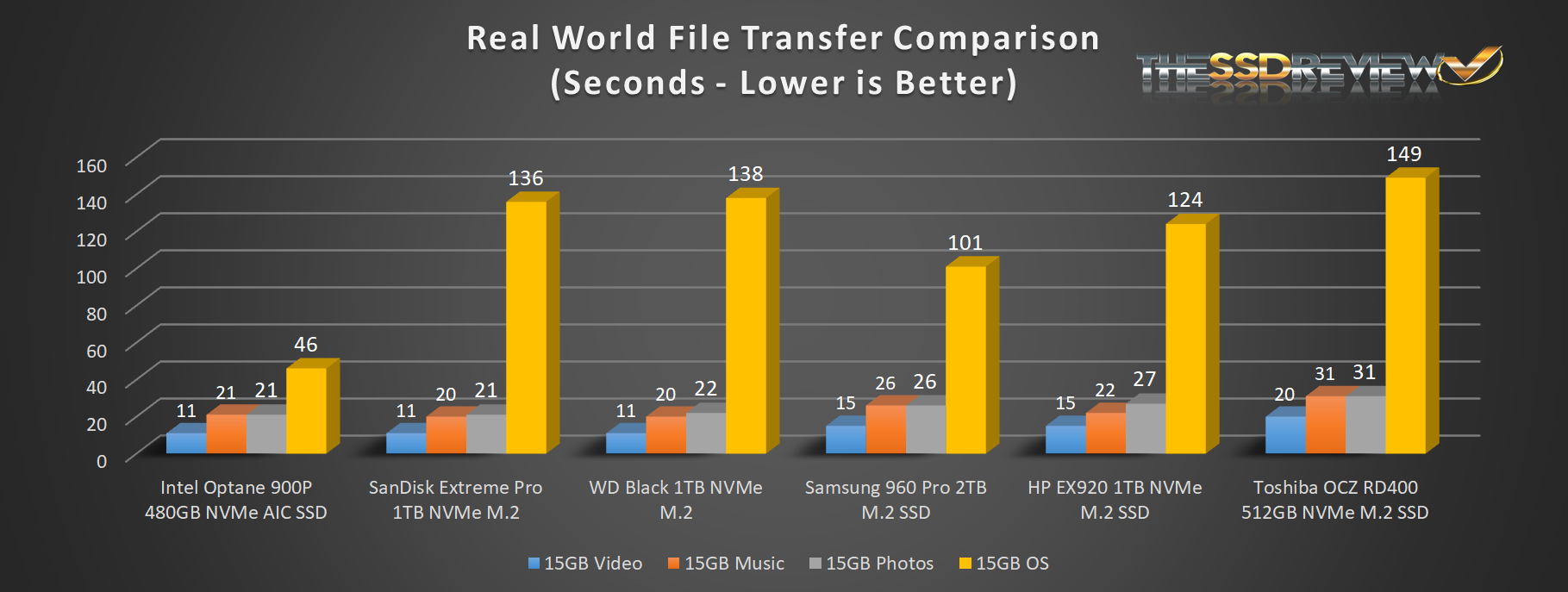For our Real World File Transfer Comparison, we have included the Intel Optane 900P, Samsung 960 Pro, HP EX920 NVMe SSD and Toshiba RD400 in our testing with the SanDisk Extreme pro and WD Black 1TB NVMe SSDs. This test is conducted through the transfer of data from one spot on the test drive to another to give us the truest of transfer speed results for that device.