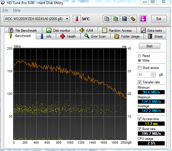 As we can see from the graph, the drive averaged at 145 MB/s and stayed near the 150 mark for the first half of the test, and as the test went on it started to degrade in speed. This is normal behavior for a mechanical drive.