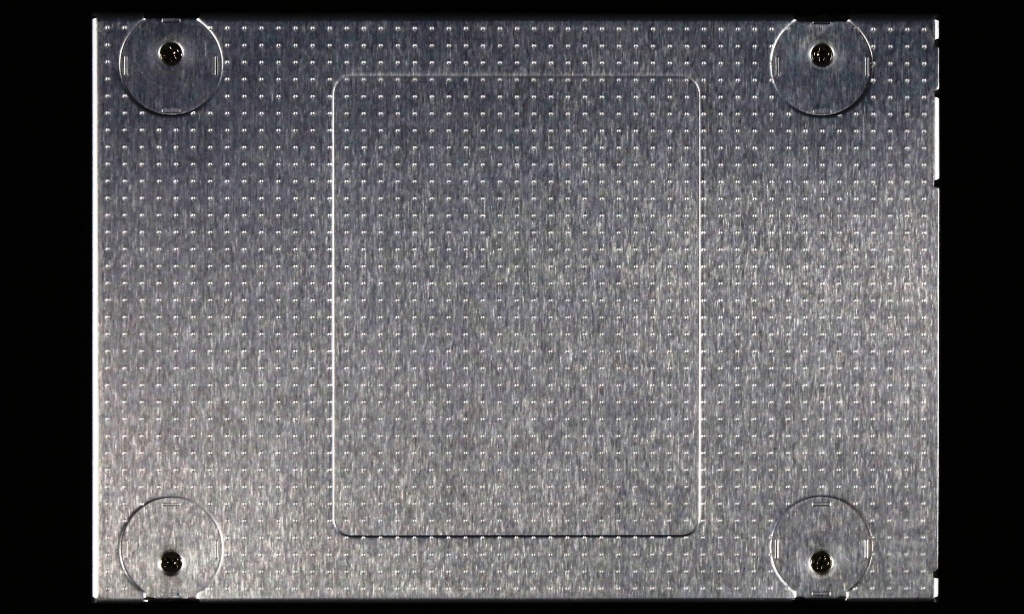 A quick look at the SSD disassembled displays eight screws, four of which secure the PCB to the case and four others that secure the bottom plate to the exterior. You might notice the pink rubber pads on the left. These were originally on all memory modules, as well as the controller, and serve the purpose of transferring heat to the exterior casing where it is dissipated.